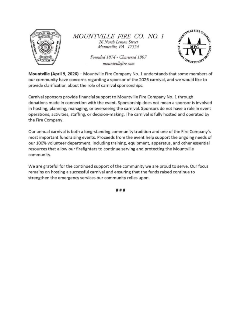 - Mountville Fire Company No. 1 public statement on carnival sponsorships (April 2026)